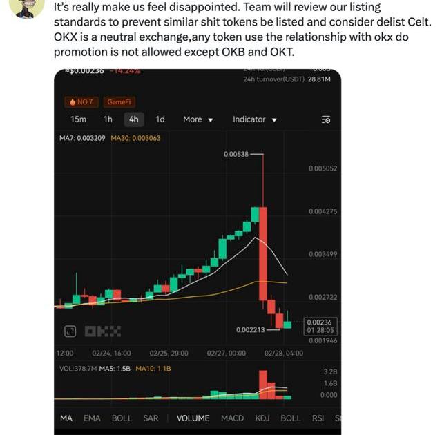 今日,徐明星发推称,这让他们感到十分失望。团队将审查其上市标准,以防止上架类似的垃圾代币,并考虑下架CELT。OKX是中立的交易所,除OKB和OKT外,任何代币不得利用与OKX的关系进行推广。