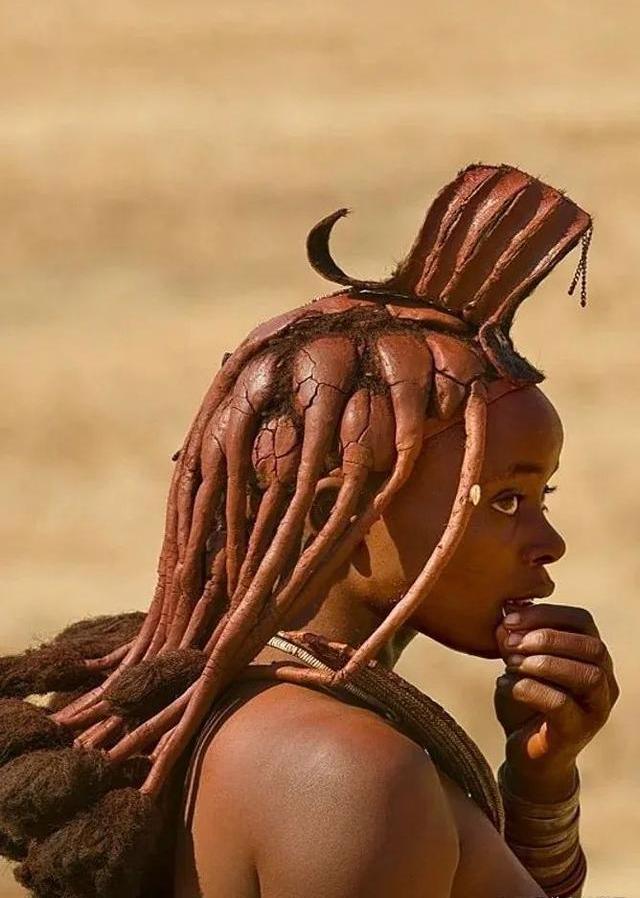 纳米比亚的辛巴族妇女,头发上的“泥巴”被称为“otjize膏”,是一种乳脂和赭石颜料的化妆品混合物,不仅可以滋润长时间缺水的干燥皮肤,还能防止中暑的以及昆虫叮咬。