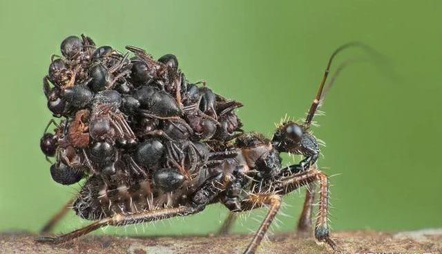 猎蝽:是一种掠食性昆虫,主要捕食蚂蚁,但也捕食各种小昆虫,例如苍蝇、小蚱蜢和甲虫。奇特的是它们会背着猎物的尸体来伪装自己,遮掩其原来面目。