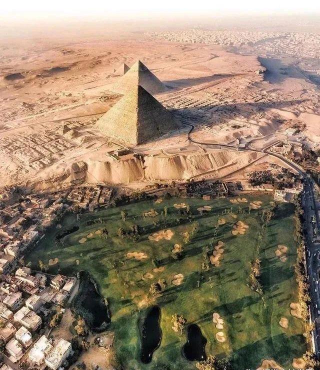 虽然看起来很假,但是在埃及开罗的金字塔群的旁边,有一个巨大的高尔夫球场…