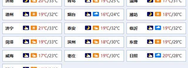 最高气温:聊城、菏泽、济宁、济南、淄博和泰安33℃左右,沿海地区26℃左右,其他地区30℃左右。