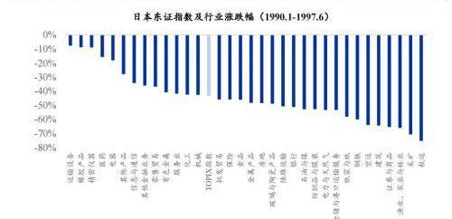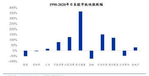 在日本后泡沫经济时代初期,板块间行情表现分化较大,顺周期板块表现普遍较差,金融、房地产、公用事业、电信服务、能源、材料等行业龙头股全线下跌。而这一期间股价表现靠前的公司主要分布在信息技术、日常消费、可选消费、医疗保健等行业。
