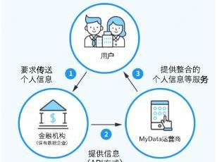 用户通过MyData运营商的App行使“个人信用信息传送要求权利”,要求金融机构将所需信息提供给MyData运营商,随后,金融机构通过API方式将用户信息传递给MyData运营商,用户就可以通过MyData运营商一站式查询个人信息。