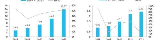 营业收入增长带动利润增长,归母净利润连续5年增长,从2018年0.89亿元增长至2022年2.43亿元,对应CAGR达28.54%。
