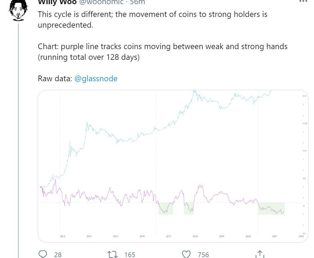 加密货币分析师WillyWoo在推特发文表示,当前的市场周期与以往不同,加密货币前所未有地流向强势持有者。他认为不可能进入熊市。从本周的价格走势来看,这一点很明显。WillyWoo表示,加密货币进入公司负债表可能产生影响。灰度比特币信托目前占比特币供应量的3.5%,只允许比特币流入冷存储库。2017年以来规模不断扩大的杠杆市场可能也起到了一定作用。大量的代币为了交易而移动,而杠杆作用较少的代币在相同的投机量下也需要移动。在比特币的早期,它被当作一种货币使用,所以比特币在流动性更强的持有者手中流通是有道理的。