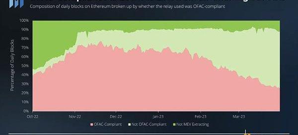 在2022年第四季度,当时对审查的担忧达到历史最高点时,我们就认为以太坊的审查担忧被过分夸大了。时间证明这是正确的。本季度末,使用审查中继器的验证者比例仅为29%,低于本季度初的61%。任何受美国外国资产控制办公室制裁的地址都可以在3个区块中的2个区块中包含交易。以太坊仍然是一个中立的基础层。