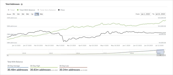 通过仔细观察有比特币余额的地址总数,可以明显看出,比特币持有者的数量也在之前约3个月的时间里,在3000万稍多的范围内轻微移动。在5月初减半之前,比特币持有者的地址数曾达到3048万的峰值,而在整个7月中下旬,比特币持有者的数量持续增加,并加速上涨到新的历史高点。
