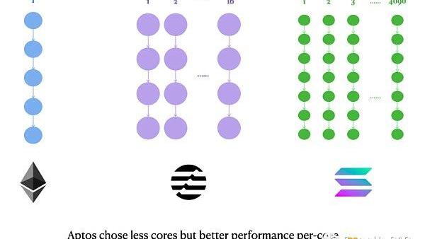 这是Solana的4096个GPU核心和以太坊的1个CPU核心之间的一个中间地带。在处理高度可并行的任务时,Aptos可能不如Solana快。Aptos的每个CPU核心都比Solana的GPU核心性能高得多,所以在NFTmint等逻辑上按顺序交易的情况下,Aptos可能比Solana处理得更好。