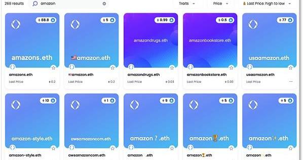 巧合的是,7月19日也正值以太坊Gas费逐渐走低的时间点,此后,ENS的新增注册量也开始增加。更有趣的是,这种关联互联网企业名称的ENS域名也在二级市场上被关注,amazon相关的ENS域名几乎是被挂售最多的。