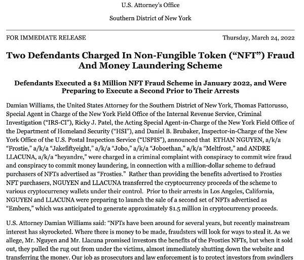 上月底,美国司法部官网披露了一起NFT涉嫌欺诈和案件该欺诈案件采用的正是俗称的“地毯式拉动”,即NFT项目的创建者在募资后突然放弃了项目并欺诈性地保留项目投资者的投入资产。