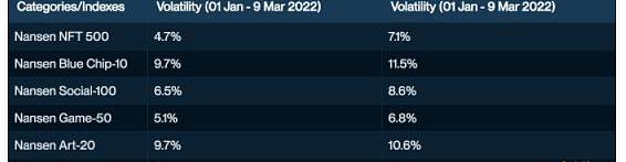 NFT类别之间的波动性不同。该指数的表现显示,元宇宙和游戏NFT是年初至今波动最小的,而蓝筹和艺术NFT在此期间波动最大。
