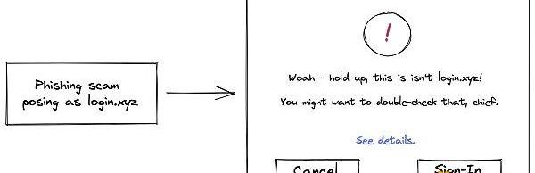 该规范还为钱包引入了额外的安全要求,例如防止网络钓鱼攻击的域绑定和防止重放攻击的随机数,在整个体验过程中进一步保护用户。例如,如果钱包找到有效的SIWE消息,但用户正在为example.com签名,但实际上是在exampie.com上,则钱包可以警告用户以下情况: