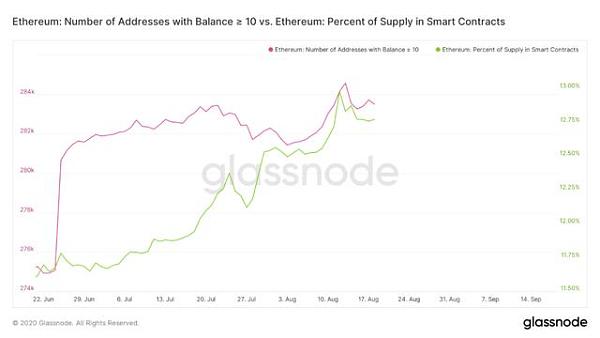 实际上,有趣的是,在同一时间范围内,以太坊地址中余额大于10的地址也出现了显著增长。据网络数据提供商Glassnode称,仅在最近三个月中,此类地址已从275K增长到283K。