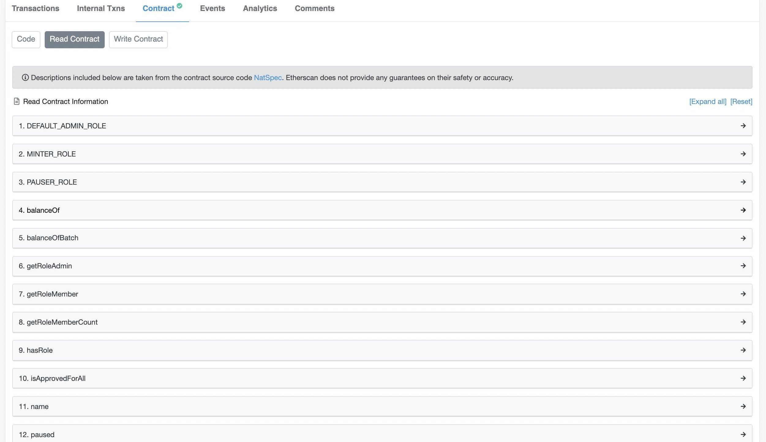 接下来是「Method」,这些是通过合约执行的功能。每个合约都是不同的,但常见的方法包括铸币、转账和批准设置。