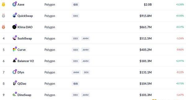 Polygon链上DeFi锁定资产前十排名及锁仓量,数据来源:Debank