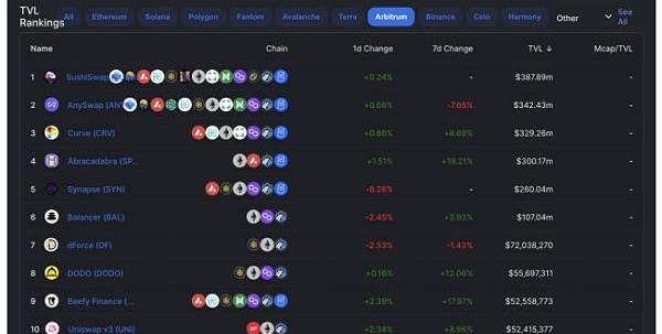 Arbitrum是一款由OffChainLabs团队开发的、基于OptimisticRollup技术的ETHLayer2项目,也是所有RollupsLayer2项目中发展最好的,其用户量、项目数量和总锁仓价值均是第一。根据DeFiLlama的统计数据,Arbitrum上总锁仓价值排名前十的项目中,Sushiswap、Anyswap、Curve和Abracadabra的锁仓量均达到了3亿美元。