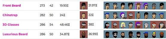 除了特征数量以外,特征的美丑和稀有度也很重要.?小毡帽(Beanie)是最稀有的也是最贵的特征,而项圈(choker)虽然也稀少但价值却没有王冠(Tiara)或者橘发(Orange?Side)高,因为项圈和朋克精神相悖。3D眼镜虽然数量很多,但由于看起来很酷,价值反而很高。