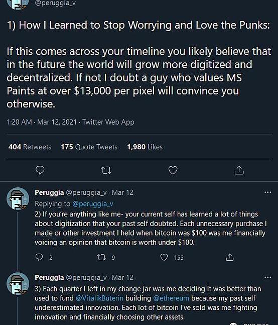 和早期的比特币一样,拥有比特币和没有比特币的人是无法交流的,拥有Punk的人也不会在意没有Punk的人的观点。?现在有人嘲笑花几万美金买Punk头像的人,就像几年前有人嘲笑卖房卖车炒比特币的人一模一样。?但没人知道NFT或者Punk会不会是下一个"比特币",因为有未知才会有定价错误?(mispricing)。???
