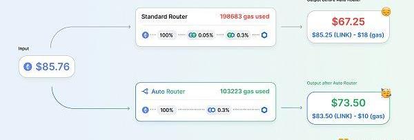 自动路由器会考虑gas成本以优化您的有效价格。随着其推出,通过最大限度地减少执行交易的gas密集型跳数,较小的交易将更有效地执行。AutoRouter知道gas成本,并且只有在产生更好的有效价格时才会多花一跳。例如,这个ETH:LINK交易节省了8美元的汽油费,通过从路线中删除一条可以提供10%更好的净价格。