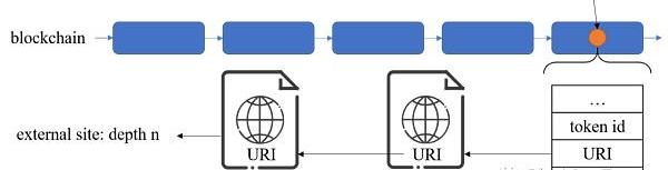 如图六所示,这一类的NFT和上面的NFT不同,这种NFT合约内部还存储了和每一个token一一对应的一个外部链接,因此在这种NFT中,一个token的信息不仅仅保存在链上,还有一部分是保存在链下的,因此,对于这种NFT,合约中会保存token对应的外部URI信息。