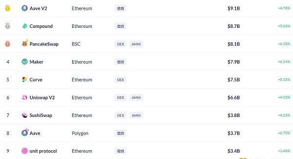 DeFi项目锁定资产前十排名及锁仓量,数据来源:Debank