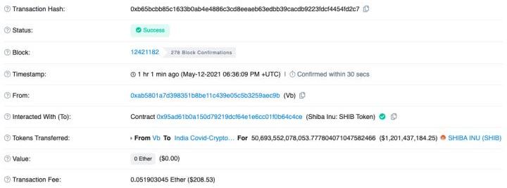 V神抛售SHIB币的所获得的资金捐将给印度新冠救济基金会。