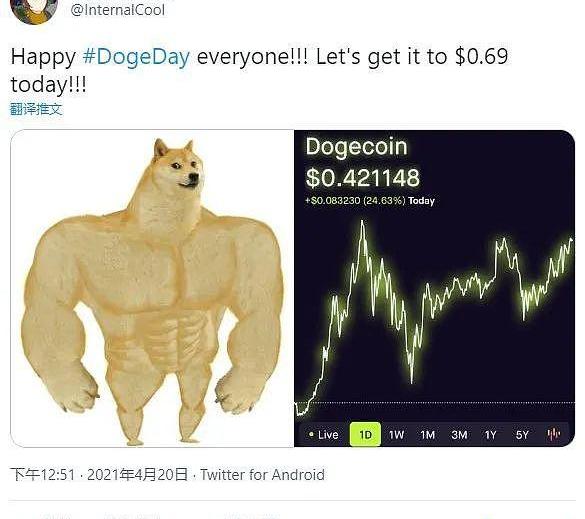 与此同时,“DogeDay”成为了当天网络大热词汇,推特上带#Doge的标签就有18.1万条推文,荣登当日榜首。有人甚至在推特上敦促狗狗币粉丝们加大力度购买,力争将其价格提高到每枚1美元。