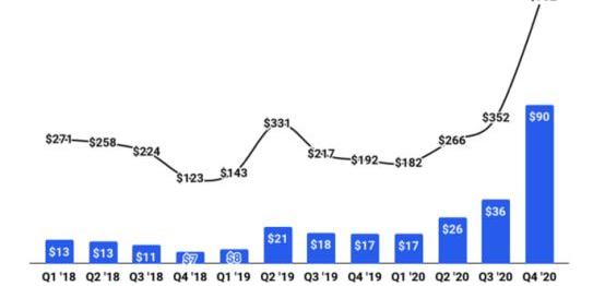 1.?交易收入:目前,这个业务线是Coinbase最重要的收入来源。如果投资者通过平台购买加密货币,就会产生相应的费用。在2020年第四季度,该业务线的收入达到4.76亿美元。