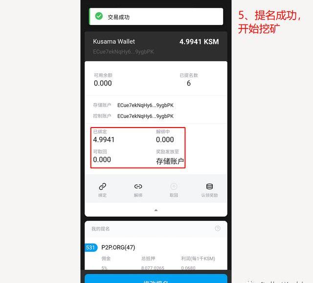 提醒一下,既然这一步属于链上交易,那么必然会收取部分手续费,下面的图片就能看到,我的KSM代币数量已经不足5个。