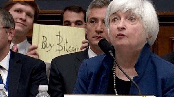 耶伦在加密货币行业一直很出名。因为她在2014至2018年担任美联储主席,曾经diss比特币,宣称自己不是比特币的粉丝。此外她还和加密货币圈的一个著名MEME“BitcoinSignGuy”联系在一起。2017年耶伦在国会参加听证会直播时,一个小伙在其背后举起一个“BuyBitcoin”的牌子,并被实时直播给全世界。