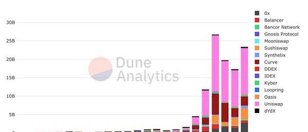 在2020年,Uniswap被用于交易价值超过580亿美元的资产。九月份,Uniswap的业务量曾一度超过Coinbase。这种增长并不仅限于Uniswap。DEX公司的业务量正在全面增长:
