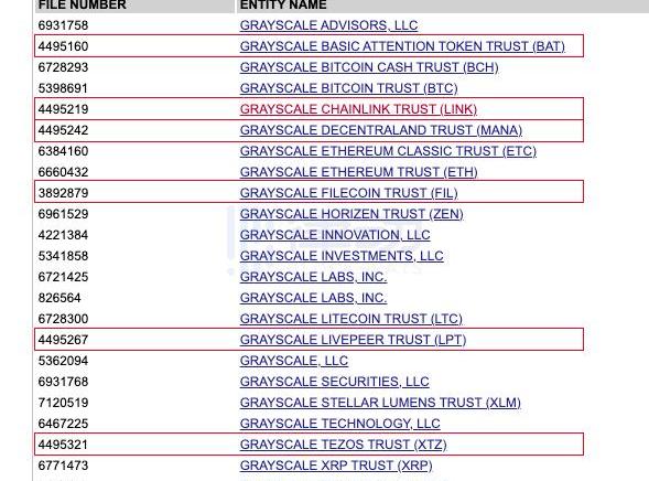 经查询特拉华州政府官网,出现了疑似与灰度有关的信托实体,分别为「GRAYSCALEBASICATTENTIONTOKENTRUST(BAT)」、「GRAYSCALECHAINLINKTRUST(LINK)」、「GRAYSCALEDECENTRALANDTRUST(MANA)」、「GRAYSCALEFILECOINTRUST(FIL)」、「GRAYSCALELIVEPEERTRUST(LPT)」、「GRAYSCALETEZOSTRUST(XTZ)」六个信托实体。