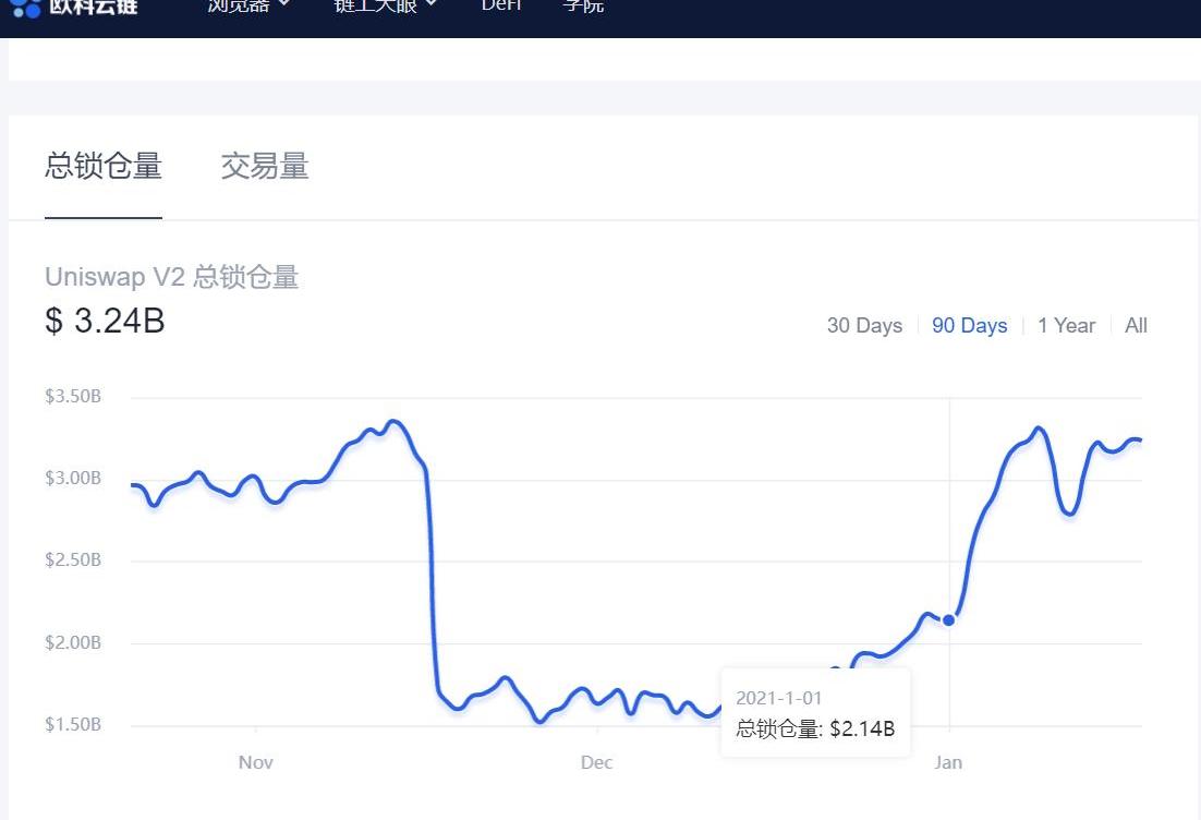 而自12月中旬开始,Uniswap的锁仓量开始回升,并在近期重回30亿美元的关口;代币Uni的价格同样自低位持续上涨,涨幅和走势与Uniswap的锁仓量呈现出较为明显的关联。