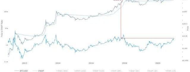 BTC-VWAP指标当前读数为2.57,约达到2017年最高水平的58%,对应的比特币价格距离2017年牛市峰值有近3.5倍的空间。