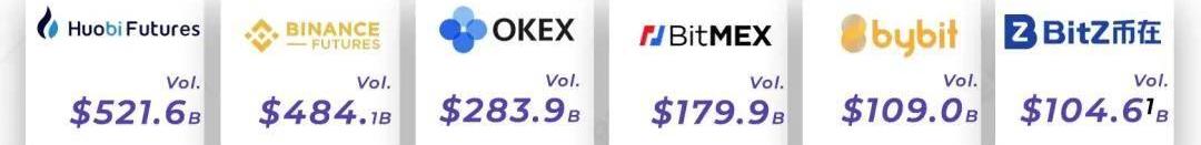 在以上八个交易所中,Binance本季度市场占有率较上季度实现较好的增长,BitMEX出现了下滑,其它交易所市场占有率则和上季度基本持平。同时,包括HuobiFutures、Binance、OKEx、BitMEX、Bybit、BitZ在内的6个交易所在本季度成交量达$100B以上。