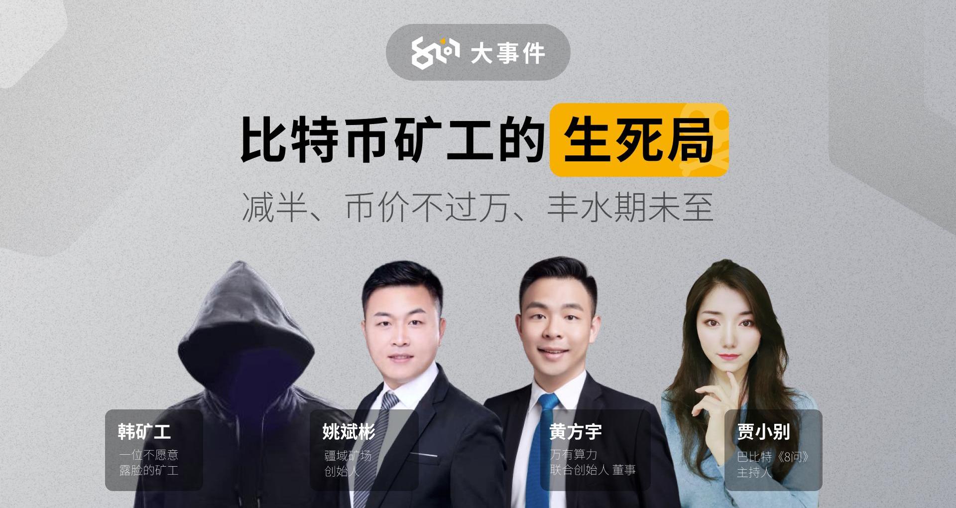 比特币减半、币价不过万、丰水期未至、再加上不稳定的政策,这是灾难的开始还是变局之机?5月25日,巴比特《8问大事件》邀请了3位一线矿场主,亲述减半后的矿圈真实状态,他们分别是疆域矿场创始人姚斌彬、万有算力联合创始人兼董事黄方宇,以及神秘的韩矿工,这可能是你看过最矿工的直播了。