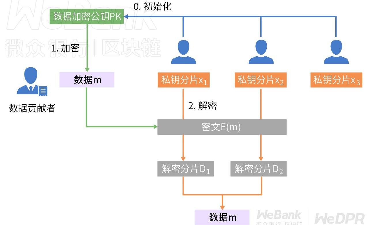 私钥的所有权由多个指定的秘密持有者联合控制,只有满足数目的秘密持有者合作,将解密分片聚合,才能实现解密。