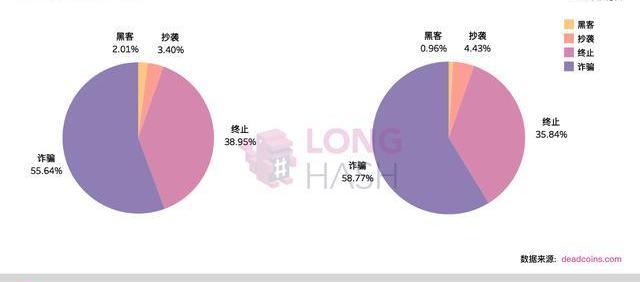这些项目是如何走向死亡的呢?DeadCoins.com将这些项目分成了四类,分别是Deceased(终止),Hack(黑客),Scam()和Parody(抄袭)。其中跑路的项目占据了大头,2019年和2018年分别有58%和55%的项目都是属于割韭菜跑路项目,而做不下去终止的项目分别占到35%和38%,剩下的一小部分项目属于被黑客攻击或者是抄袭其他项目。