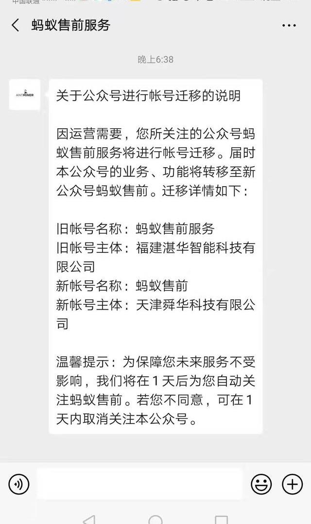 《每日经济新闻》记者注意到,1月7日,比特大陆旗下原名为“蚂蚁售前服务”的微信公众号发布声明进行账号迁移,原因是“运营需要”。