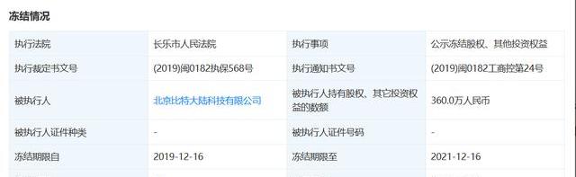 2019年12月16日,公开信息显示,福建长乐市人民法院冻结了北京比特大陆科技有限公司对全资子公司福建湛华智能科技有限公司360万元的持有股权及其他投资权益,冻结时间为2019年12月16日至2021年12月16日。