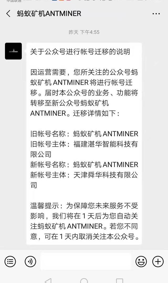 1月9日,比特大陆旗下原认证为“蚂蚁矿机ANTMINER”的微信公众号也发生账号迁移。