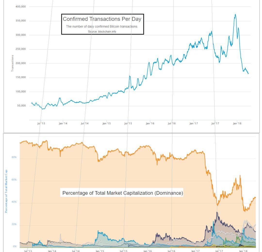 我们可以看到比特币在2017年5月跨过了“1美金交易费红线”,这一趋势和山寨币的崛起相一致。同样可以看到2017年底“交易费压力”的迅速消失,然后再小幅度显现。最终可以看出,这种压力的释放和比特币网络中交易量的骤减相一致。