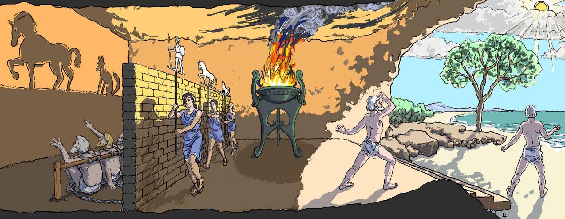 设想在一个暗无天日的山洞中,有一排被锁链锁住的囚徒,他们从小就只能看到前方的墙壁。这些囚徒们身后是一堵墙,再后面有一堆放着火,在火与墙壁之间,有一些人举着道具和木偶来回走,这样道具木偶就会在火光映射下在墙壁上投下影子。而这些囚徒们整天就只能看着这些影子。因为这些囚徒们从打出生起,所闻所见就只是前方洞壁上的各种影子,他们会以为所看到的这些影子就是真实的世界。