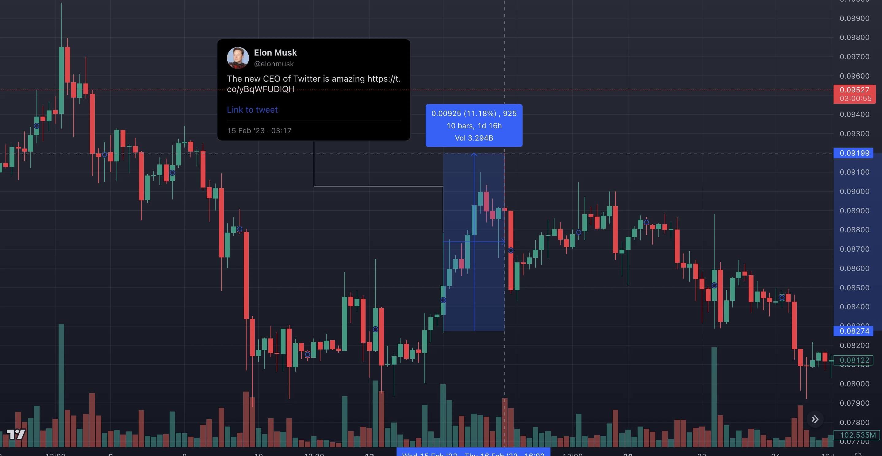 在推文发布的一个小时内,DOGE短时大涨约?6.3%?,最高触达?0.0827?。在短暂的回调后,DOGE?继续上涨,