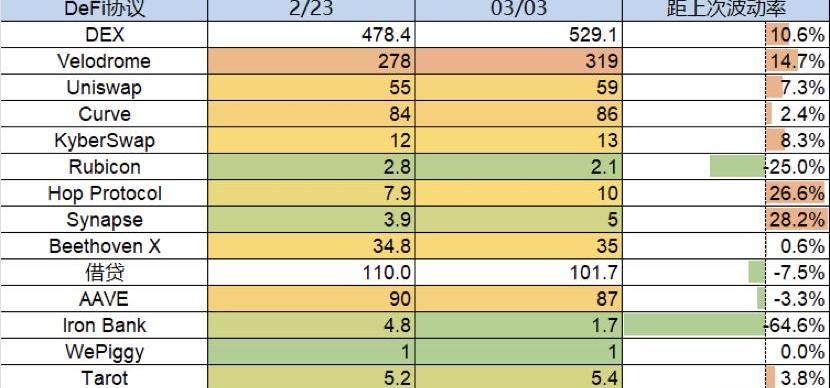 本周TVL较上周变化不大,略微下降0.11b,在layer2公链中,arbitrum持续上升3.8%,TVL上升至1.97b;optimism的涨幅最大,TVL达到了1b,相比上周也有10.76%的上涨。Avalanche的7日跌幅达到了6.81%