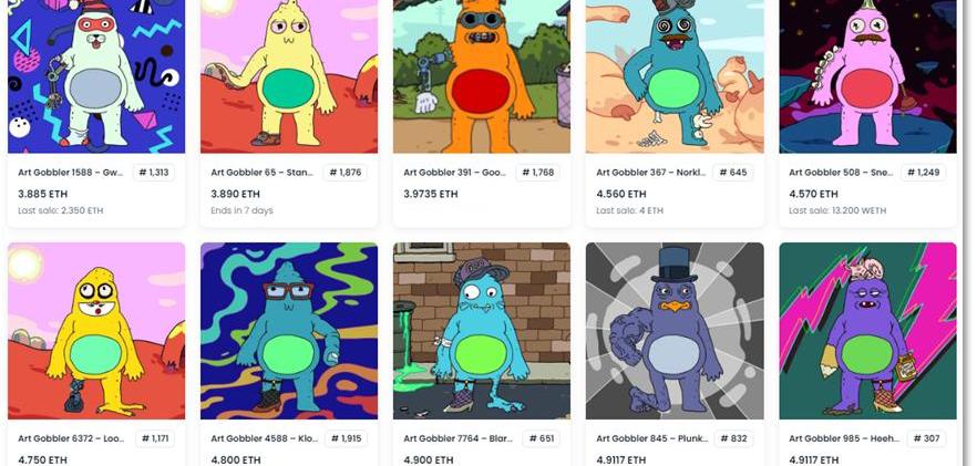 Gobblers是以外星人形象展示的动画NFT系列,发行总量为10000个,分为普通和传奇两个级别,传奇级NFT占发行总量的10%。