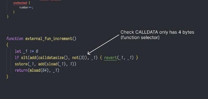 可以发现一个?number++?里面其实包含了很多检查,例如notpayable和overflow。但其实我们知道它只会以一次加?1?的方式递增所以几乎不可能会overflow,然后如果这个函式是可以接受ether的话,那就可以再省掉notpayable的检查: