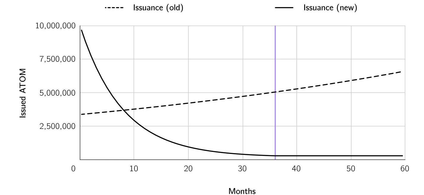 从长远来看,未偿付的ATOM预计将因此大大减少,但围绕ICS的收入和流动性质押产品的收益,有很多经济假设,可能会导致通胀高于目前的预期。36个月窗口期后的ATOM发行运行率预计每年略低于1%,而这将只指向CosmosHub财库。