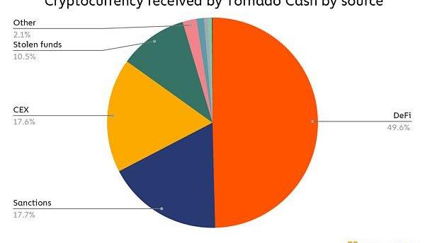 据Chainanlysis数据,自2019年8月以来,TornadoCash已收到价值超过76亿美元的以太坊,一半来自DeFi协议,18%来自受制裁的实体,而只有不到11%的资金来自盗取自加密货币服务和协议的资金。